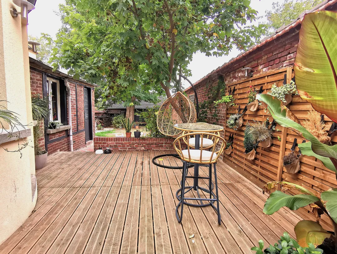 Travaux : Démolition intérieure de cloisons, fenêtres, véranda, isolation, cloison, électricité, plomberie, chauffage, carrelage, enduit et peinture intérieurs, cuisine et dressing en ameublement, aménagements extérieurs.