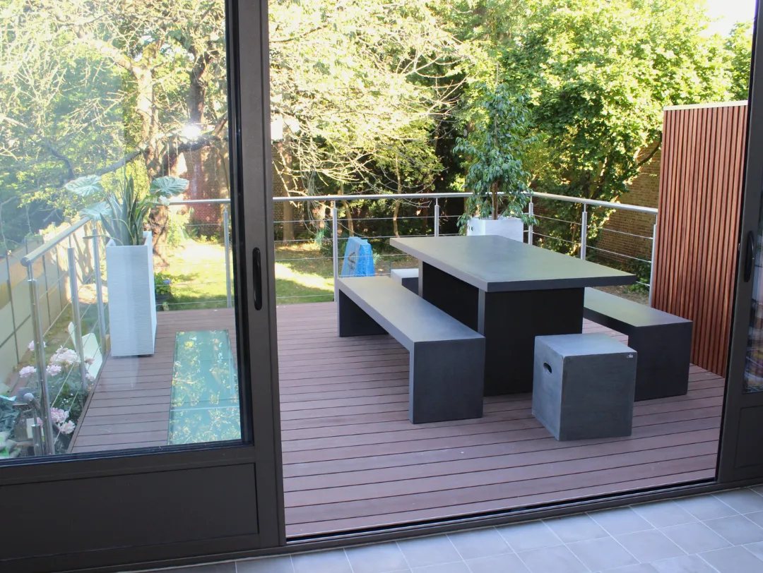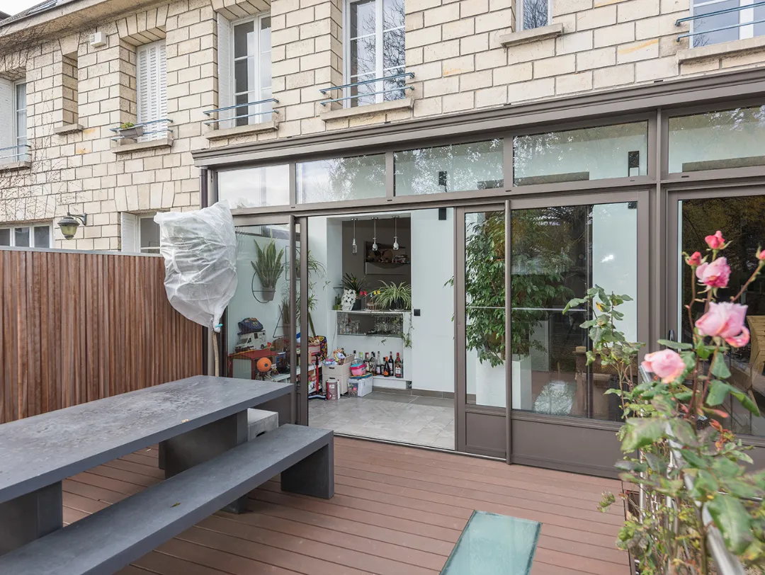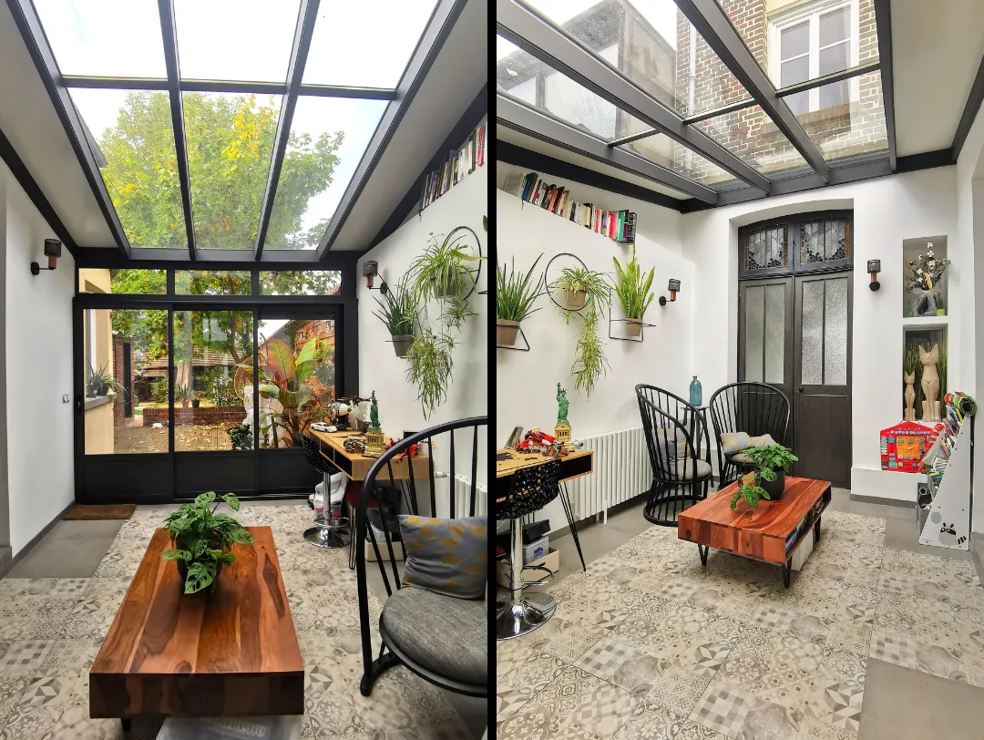 Les anciennes fenêtres de la salle de vie ont été supprimées permettant ainsi la création d’une véranda attenante à la salle à manger en place de l’ancienne terrasse, ce qui genère une sensation d’espace et de luminosité exceptionnelle.