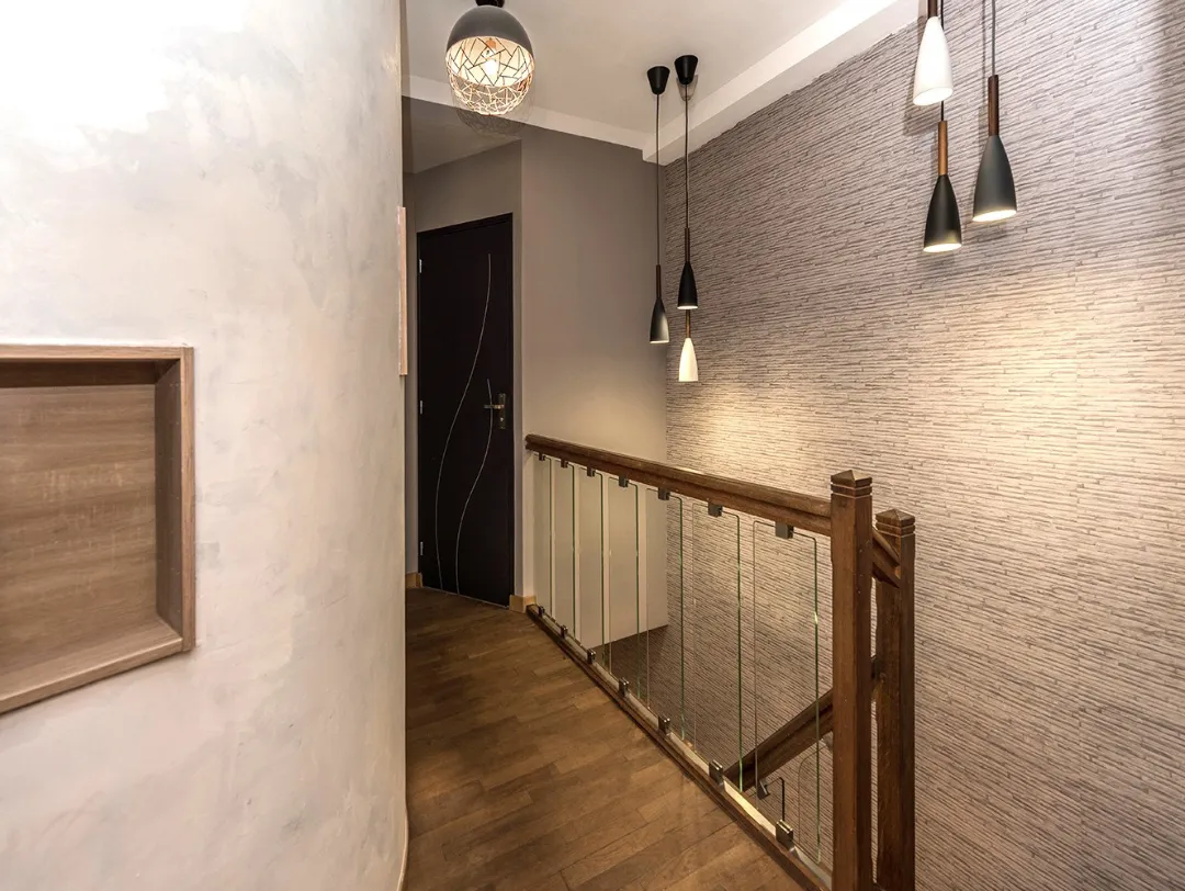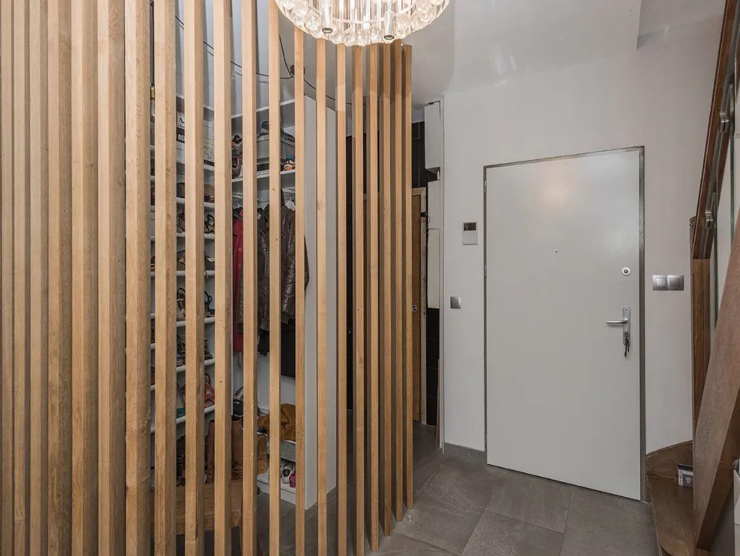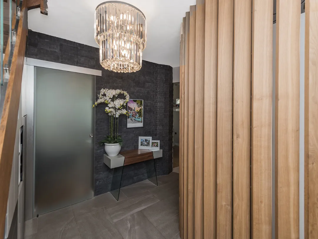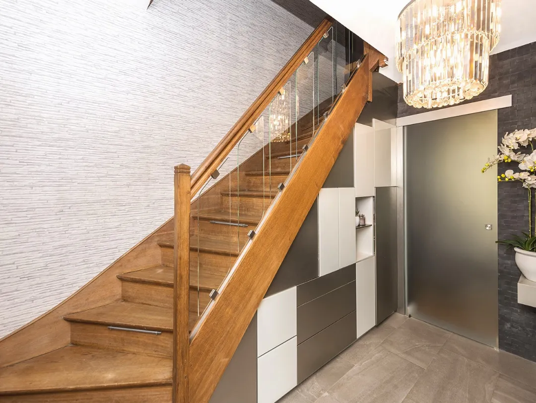 L’escalier en chêne massif dans l’entrée de l’appartement est une véritable pièce maîtresse de l’intérieur. Le remplissage des garde-corps de l’escalier a été remplacé par des éléments sur mesure en verre pour apporter une touche de prestige et un style contemporain qui fait écho au lustre.