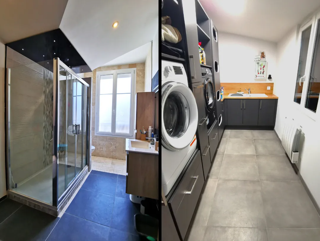 Travaux : Démolition intérieure, cloison, électricité, plomberie, chauffage, carrelage, parquet, enduit et peinture intérieurs, cuisine et buanderie en ameublement, aménagement des salles de bain