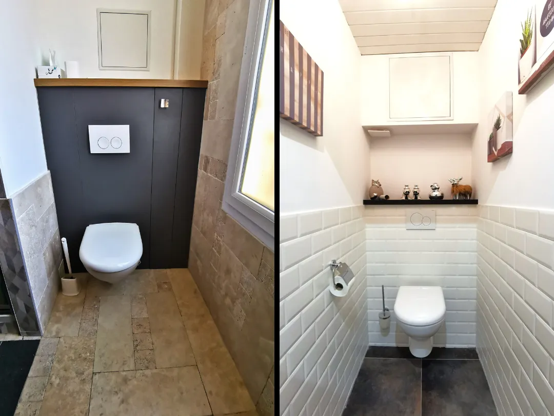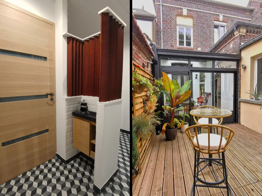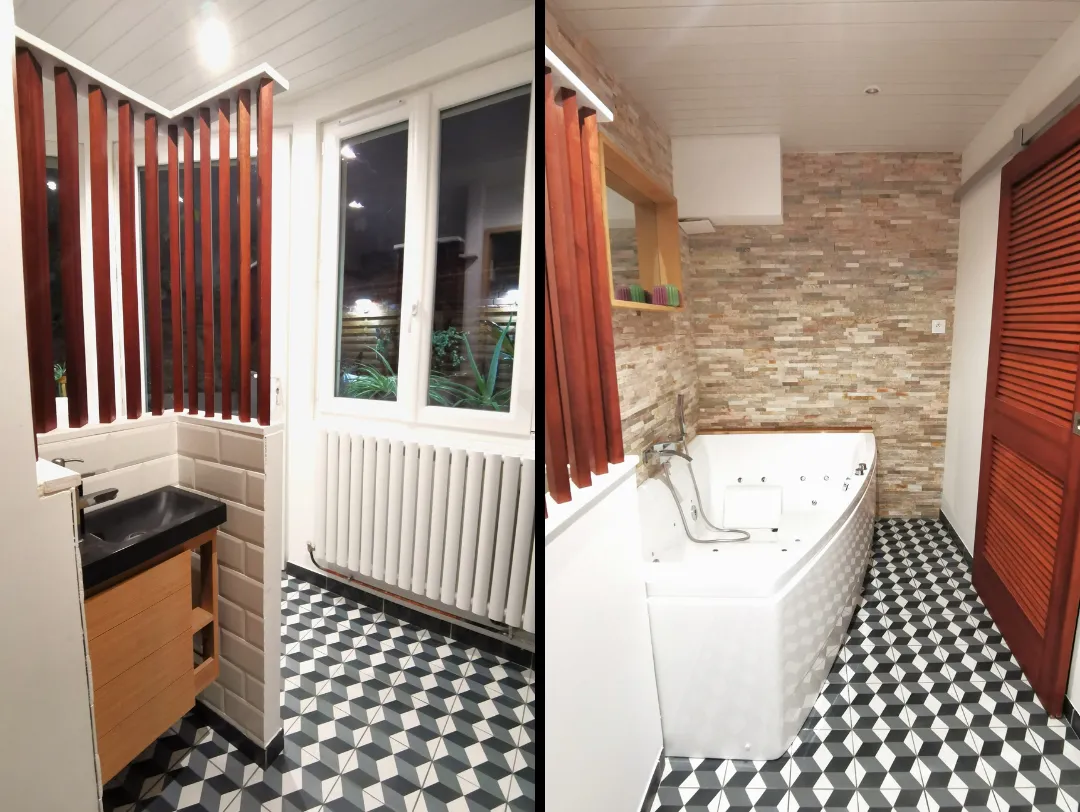 Les espaces sont redéfinis en rez-de-chaussée afin d’intégrer une salle à manger avec espace cuisine ouvert en lieu et place d’un espace aménagé temporairement pour un lit médicalisé avec douche et WC accessible. L’ancienne cuisine située à l’arrière de la maison non fonctionnelle a été divisée pour créer la nouvelle pièce des WC ainsi qu’un espace Balnéo avec accès direct sur la nouvelle terrasse/jardin. Une buanderie a également été créée dans une pièce servant de débarras dans le prolongement du nouvel espace Balnéo.Les deux chambres et la salle d’eau du 1er étage ont été entièrement repensées en matière de décoration. Le 2ème étage a été entièrement réaménagé afin de permettre la création d’une suite parentale.